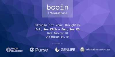 Come join us for the first ever "Bitcoin For Your Thoughts" blockchain hackathon, brought to you by Purse.io, GenLife, and Hack Reactor! This will be an opportunity to network, learn about Blockchain development, and present your project to some of the leaders in the space. We're also providing breakfast and dinner all weekend to keep you energized while you hack, plus a kickoff event (food and drink also included) the first night with guest speakers Chris Jeffery, CTO at Purse.io, and Mason Borda, CTO of GenLife. Enter for a chance to win one of three great prizes including 1BTC for first place!