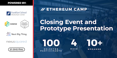 The Ethereum Camp is supported by Blogfabrik, Next Big Thing, weeve, 21 Digital and more. It is organized by the Frankfurt School Blockchain Center, the Chair of Strategy and Organization at the Technische Universität München and the blockchain accelerator nexussquared.
