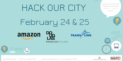 Welcome to the 2nd annual Hack Our City! New Westminster hosts Innovation Week Feb 23-Mar 3, and a highlight event is the Hack-a-thon, sponsored by Amazon and TransLink. We invite teams of 1-4 people to compete in transportation-themed apps and projects for prizes. This year's hack-a-thon takes place February 24th and 25th, 2018, from 9am to 5pm both days.