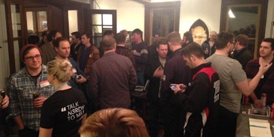 - folks arrive, grab drinks, socialize